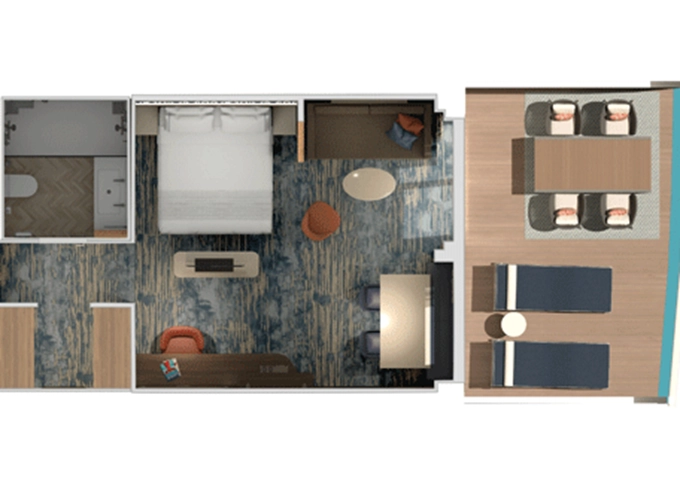 HU - Suite Havana Cabana Corner 33 m² + vonkajšie rohové patio 15 m². 8. paluba vpredu. Max 3 osoby. Tropický štýl, vstup do exkluzívnej zóny Havana. Výhody Suite. | 5 270 € 2 635 € za osobu | ||