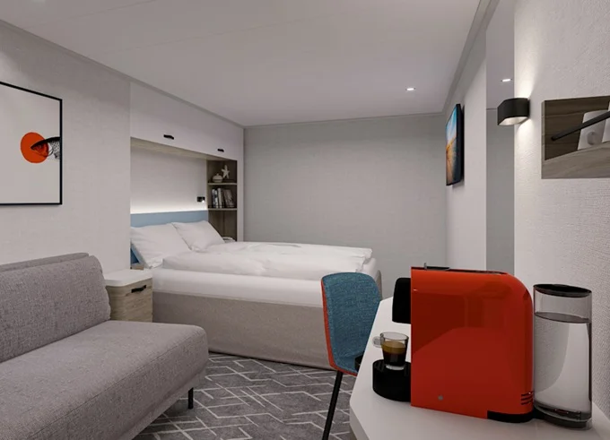 BKUS - PLUS Kajuta s balkónom 17 m² + balkón 5-7 m². Max 4 osoby. Cenový model PLUS. 4 096 € 1 024 € za osobu